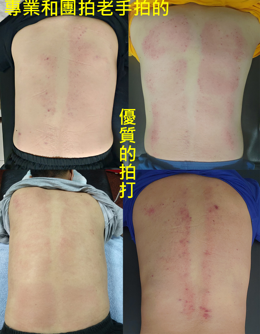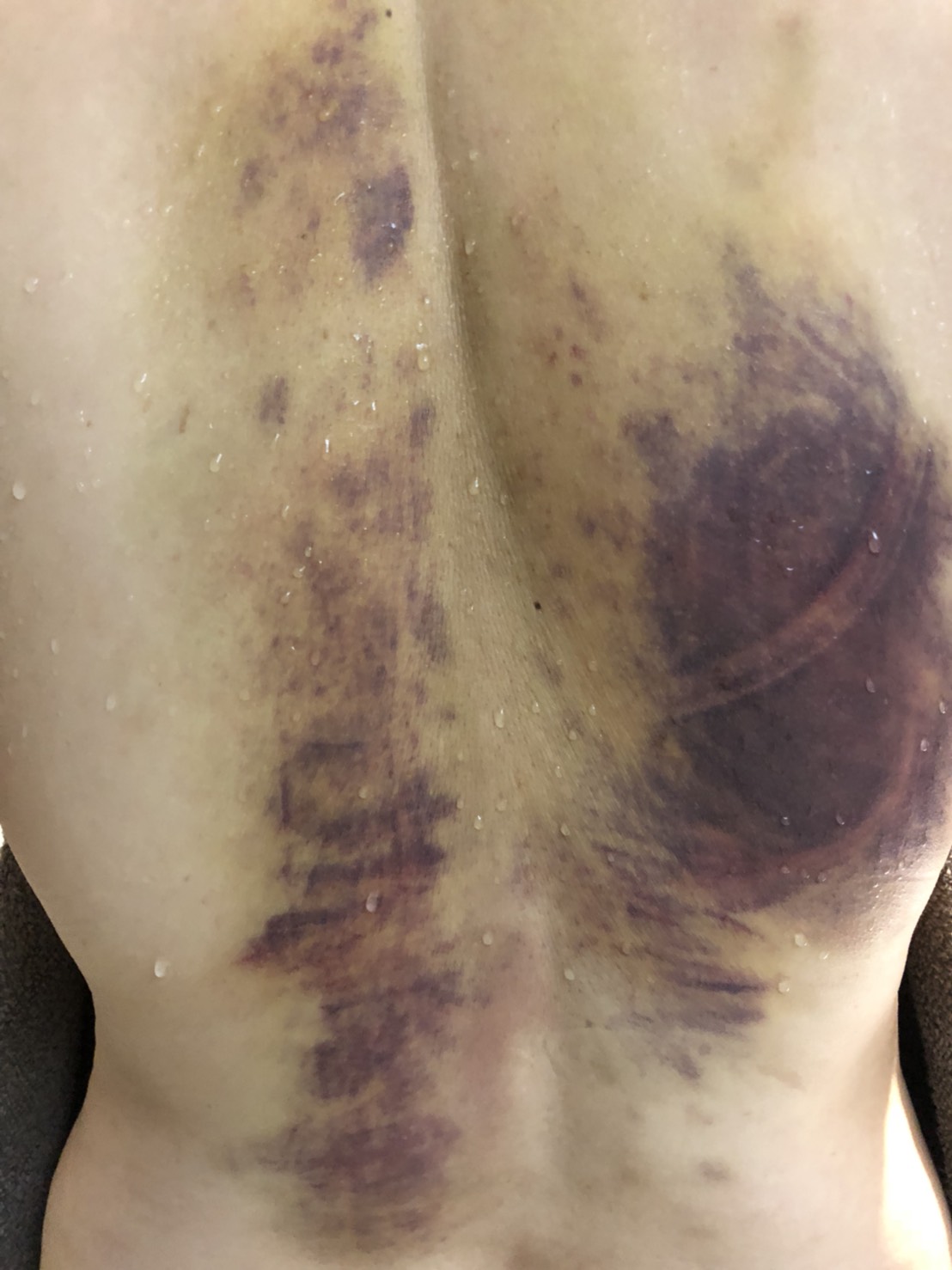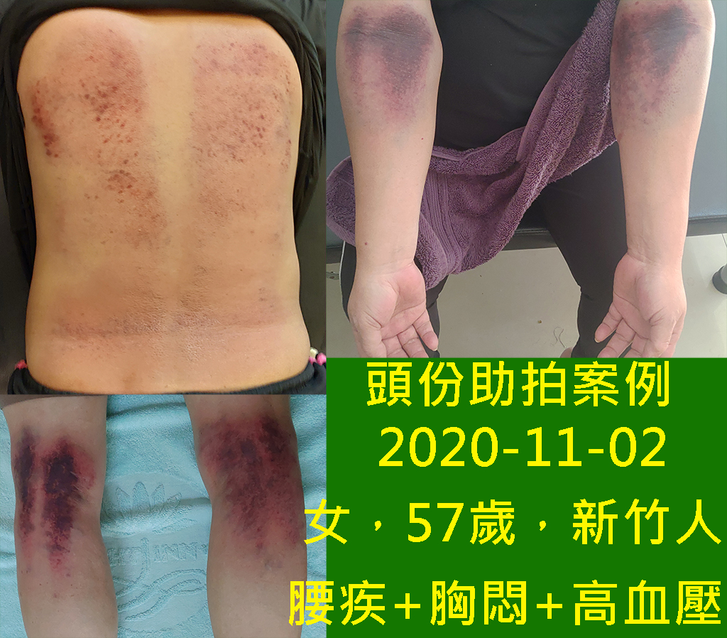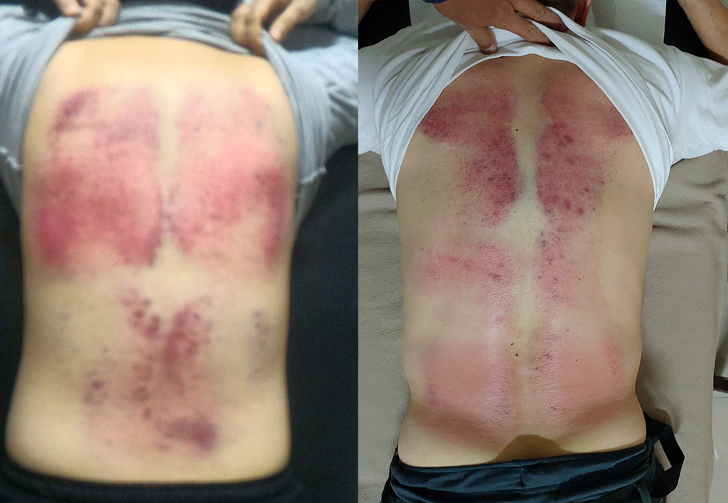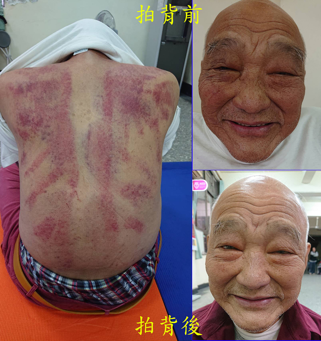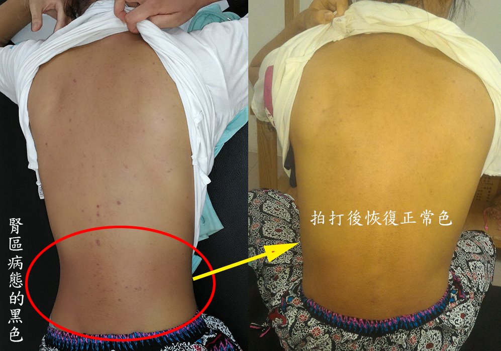 剛拍打完,拍打的位置出痧,看起來不明顯,待第二天後就會如下圖般的黑了,這很正常;