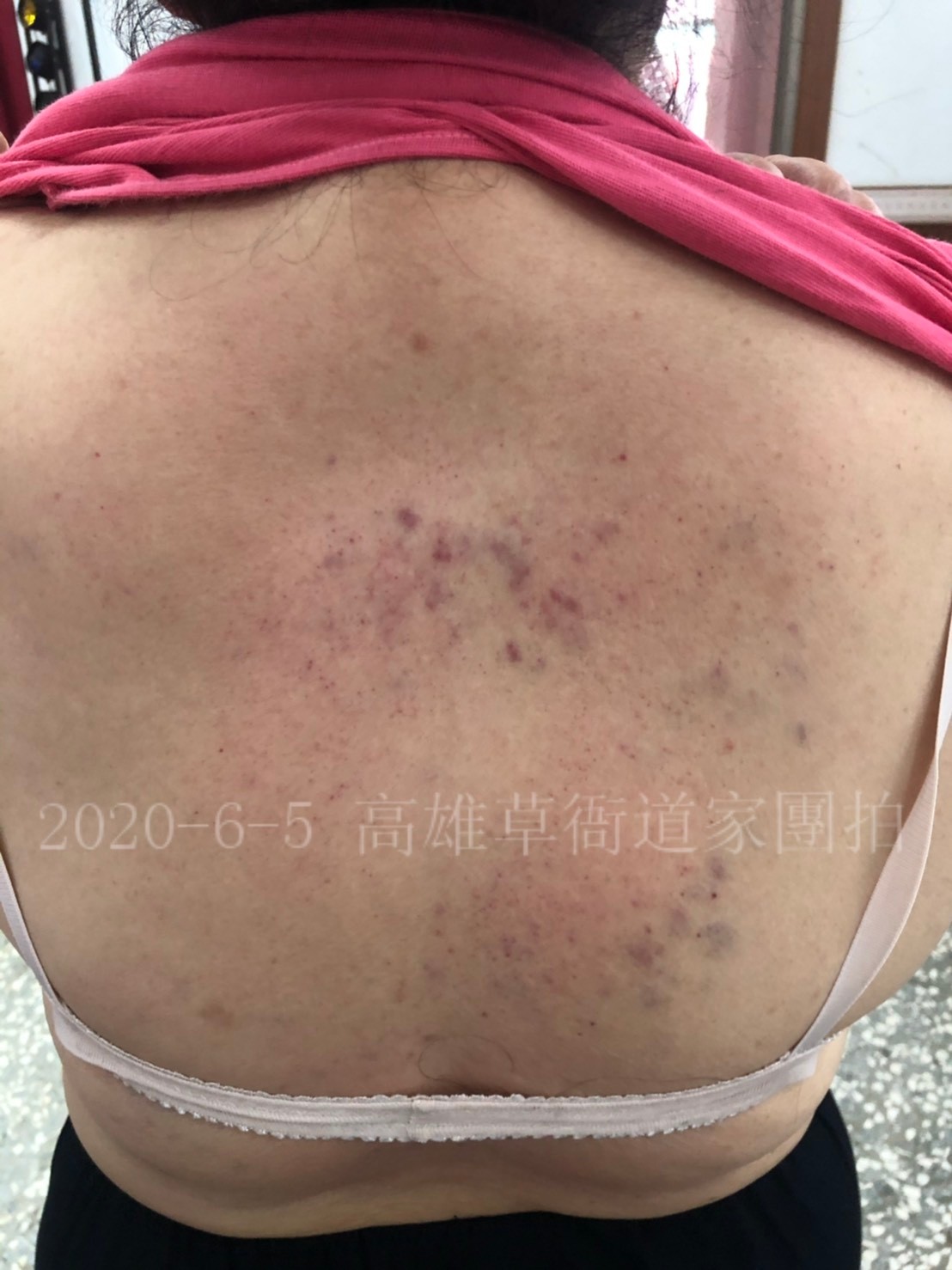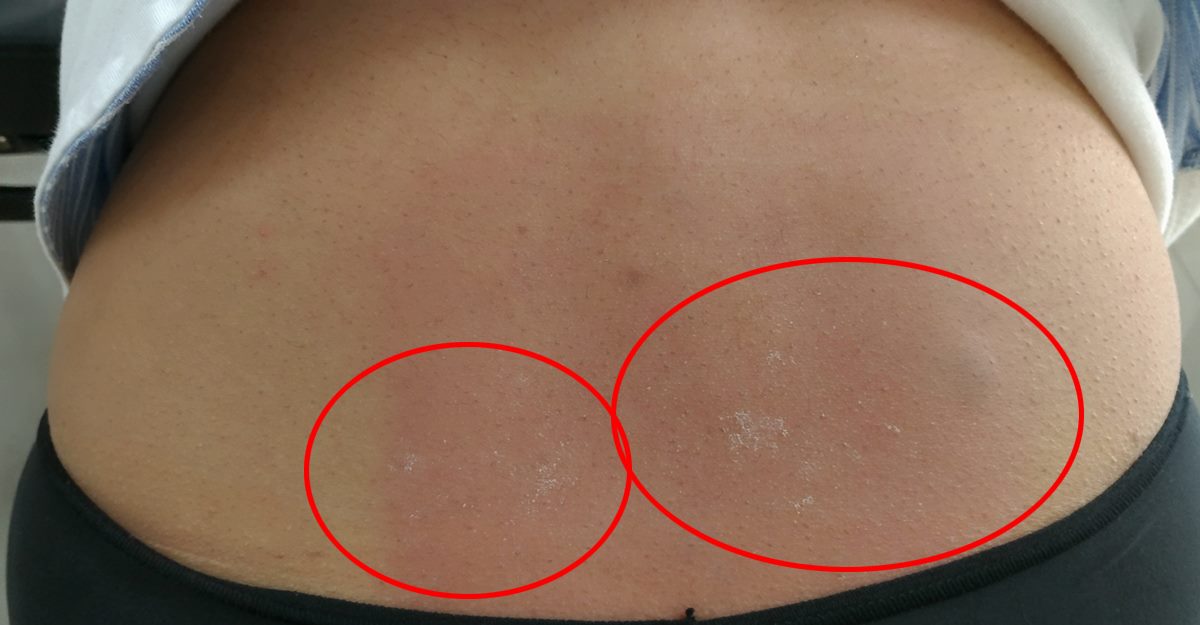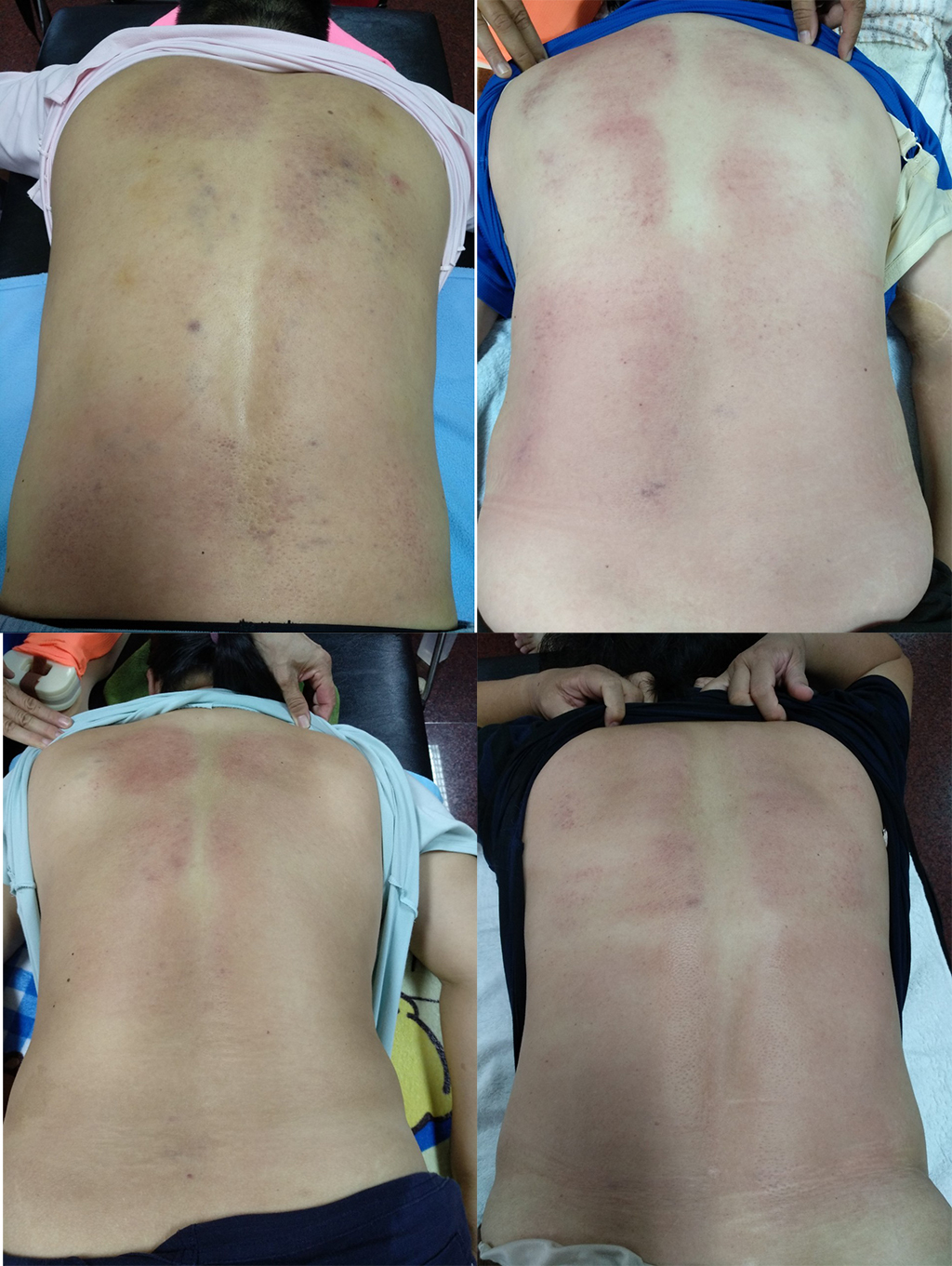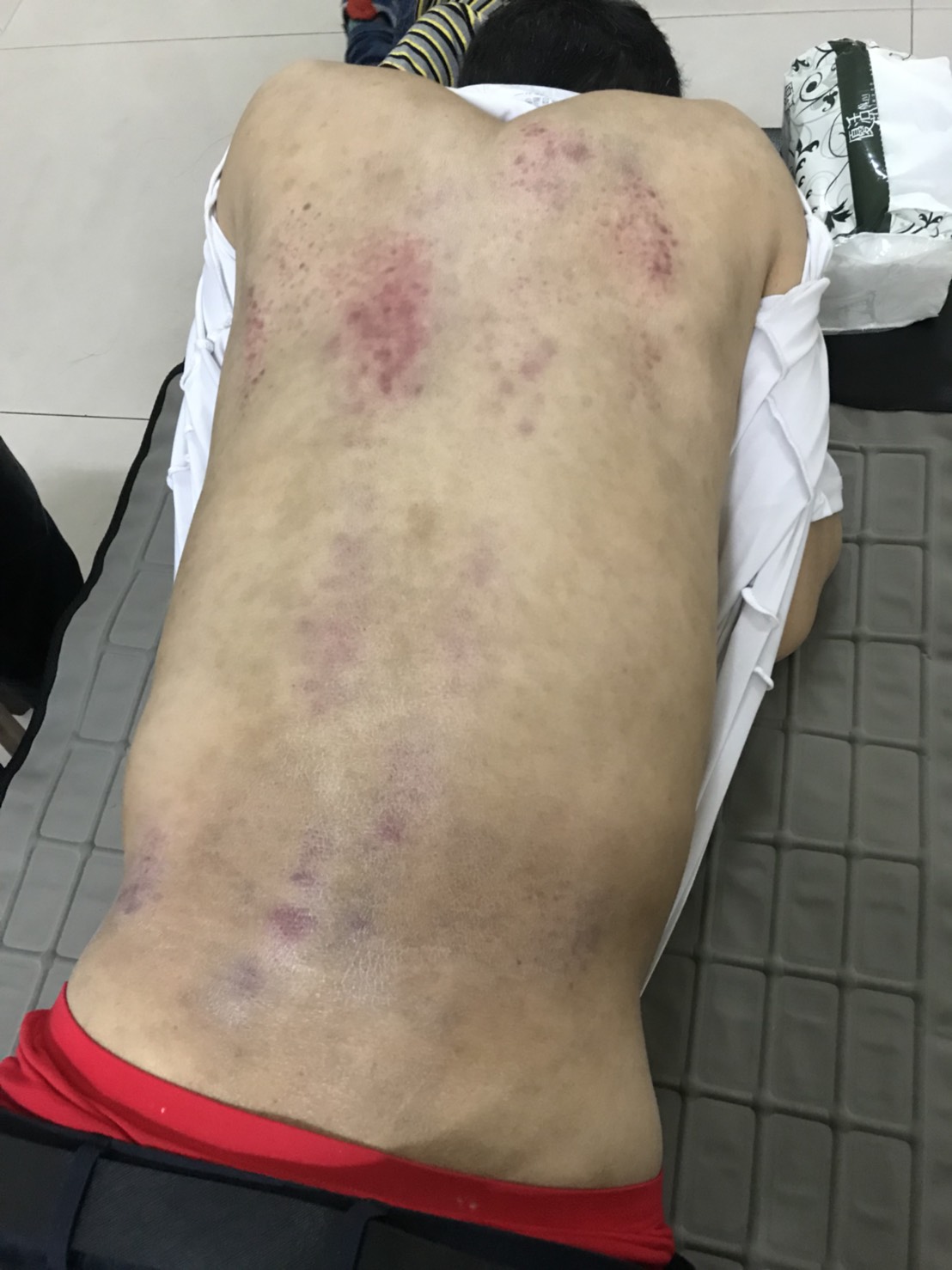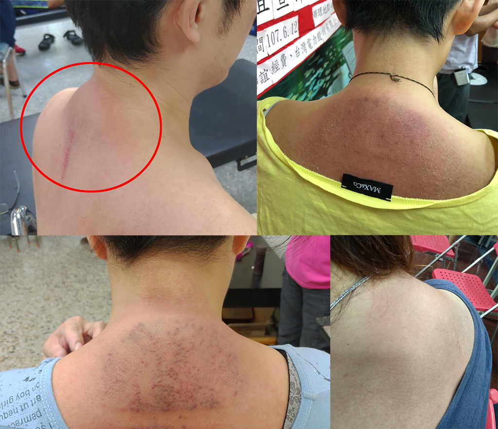 剛拍打完,拍打的位置出痧,看起來不明顯,待第二天後就會如下圖般的黑了,這很正常;
