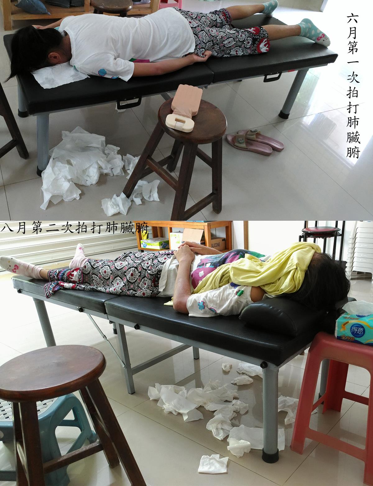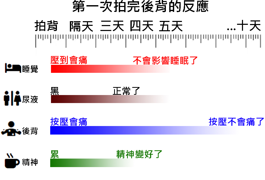 拍後背每個位置7分鐘 + 委中8分鐘 + 手肘8分鐘 = 約二小時;