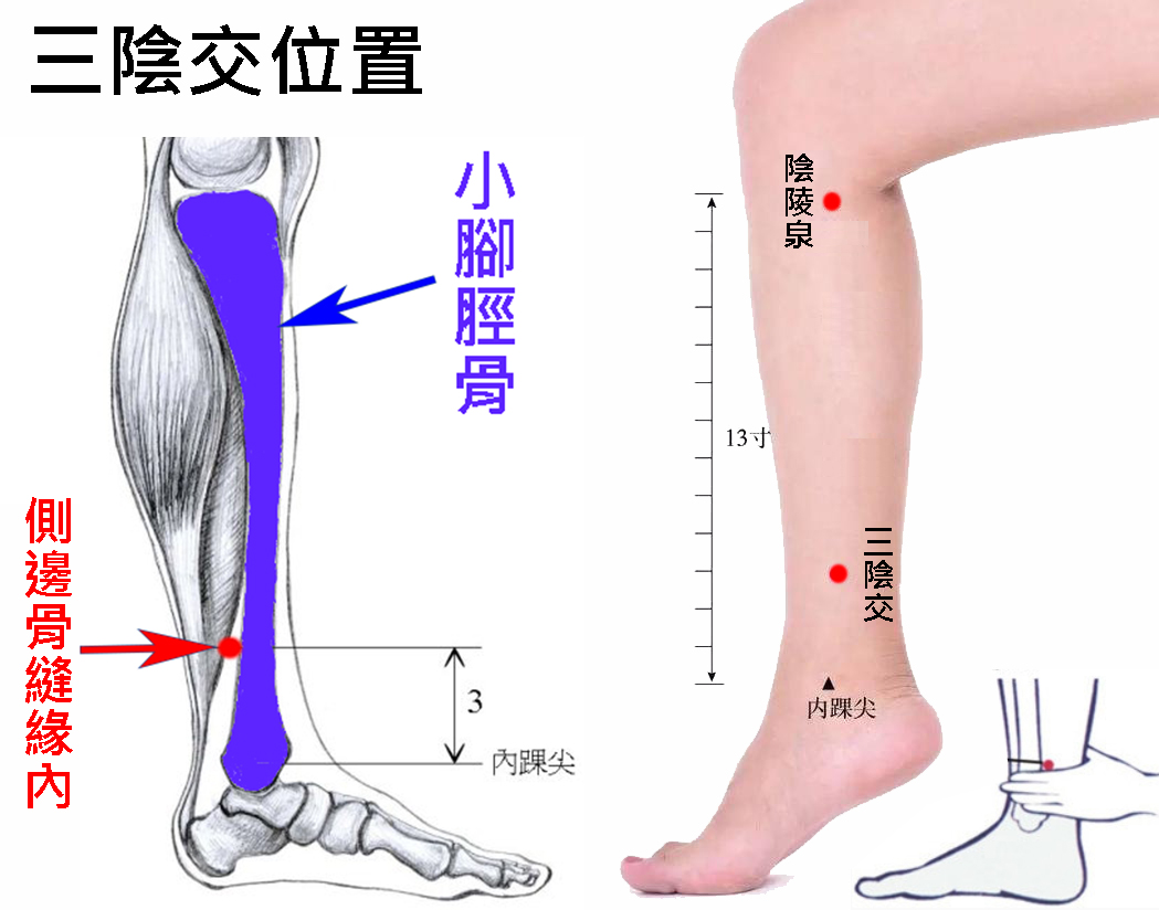 三陰交穴對應婦科疾病,例如月經失調、子宮出血、去斑、去皺、祛痘、痛經、更年期綜合症。