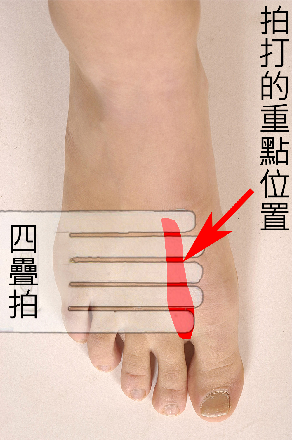 腳背的拍打是比較重要的位置,有肝脾症狀的人,要經常拍,拍到大力拍都不痛程度,尤其是有乳癌症狀的人,只要乳癌腫沒有消失,就需要拍,能天天拍最好;
