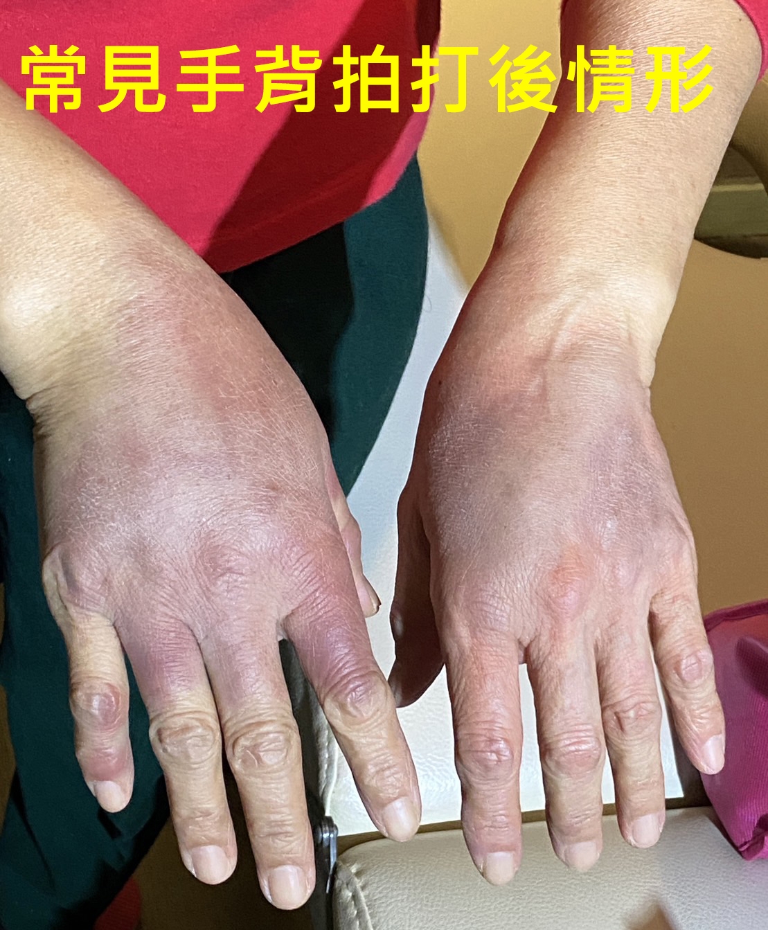 通常拍友的手被拍了之後,這個被拍的手就不宜再施力助拍,否則手的退痧會不順利,甚至於腫脹;