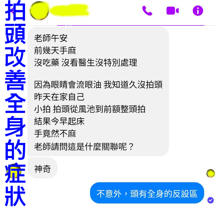 此外,用拍痧工具拍頭,拍打的效果也會比較好,這個拍友可以自行體會差異。