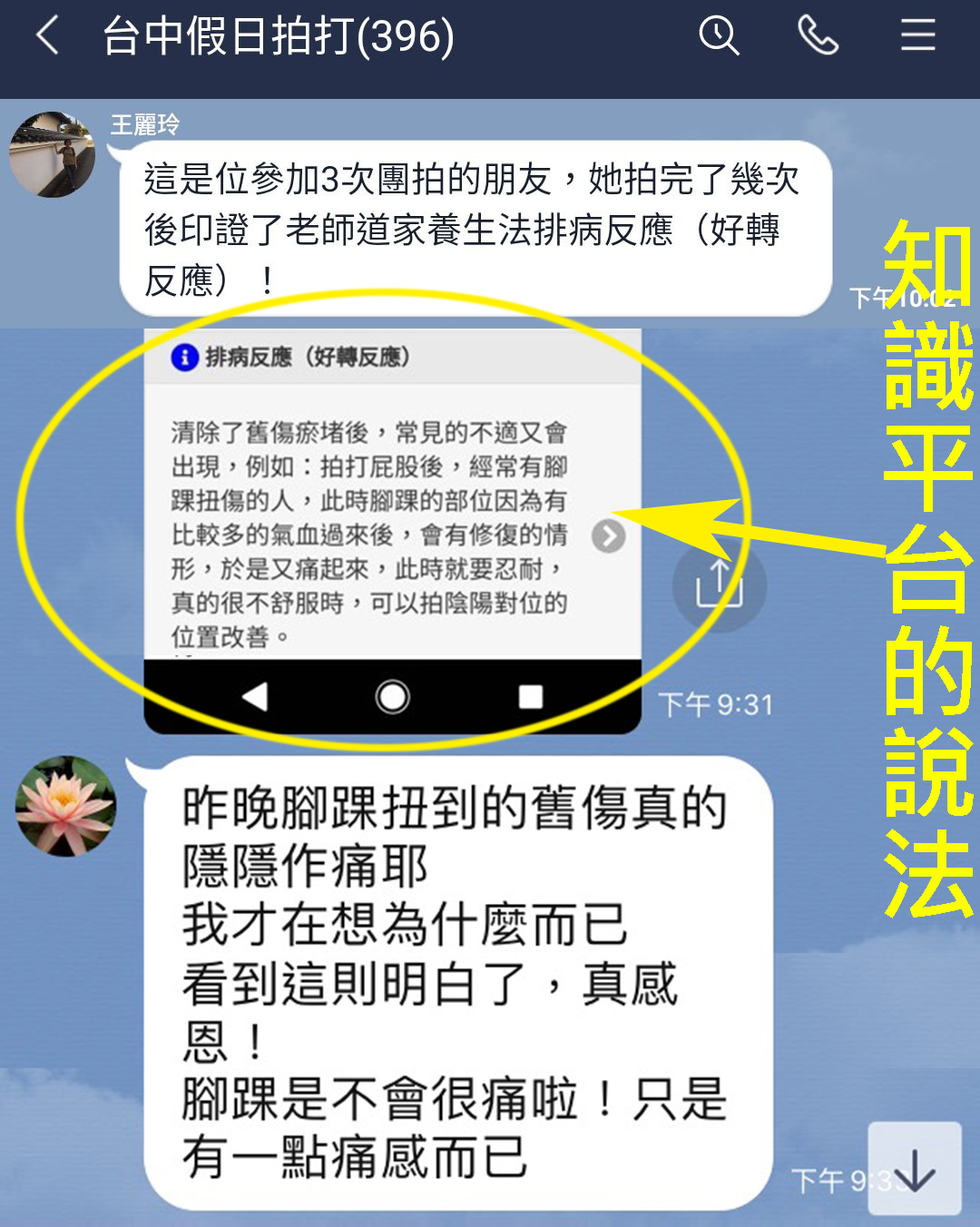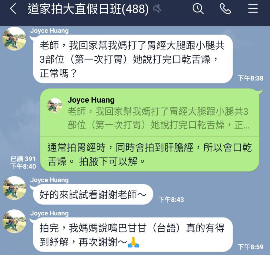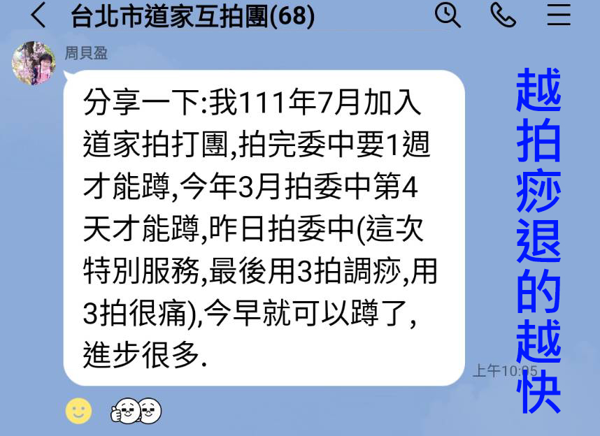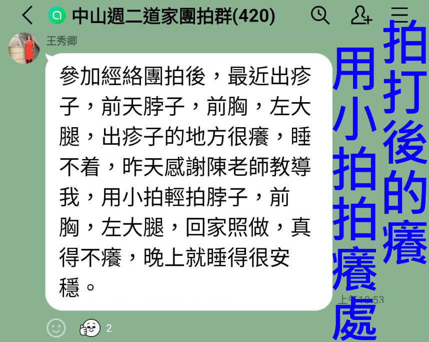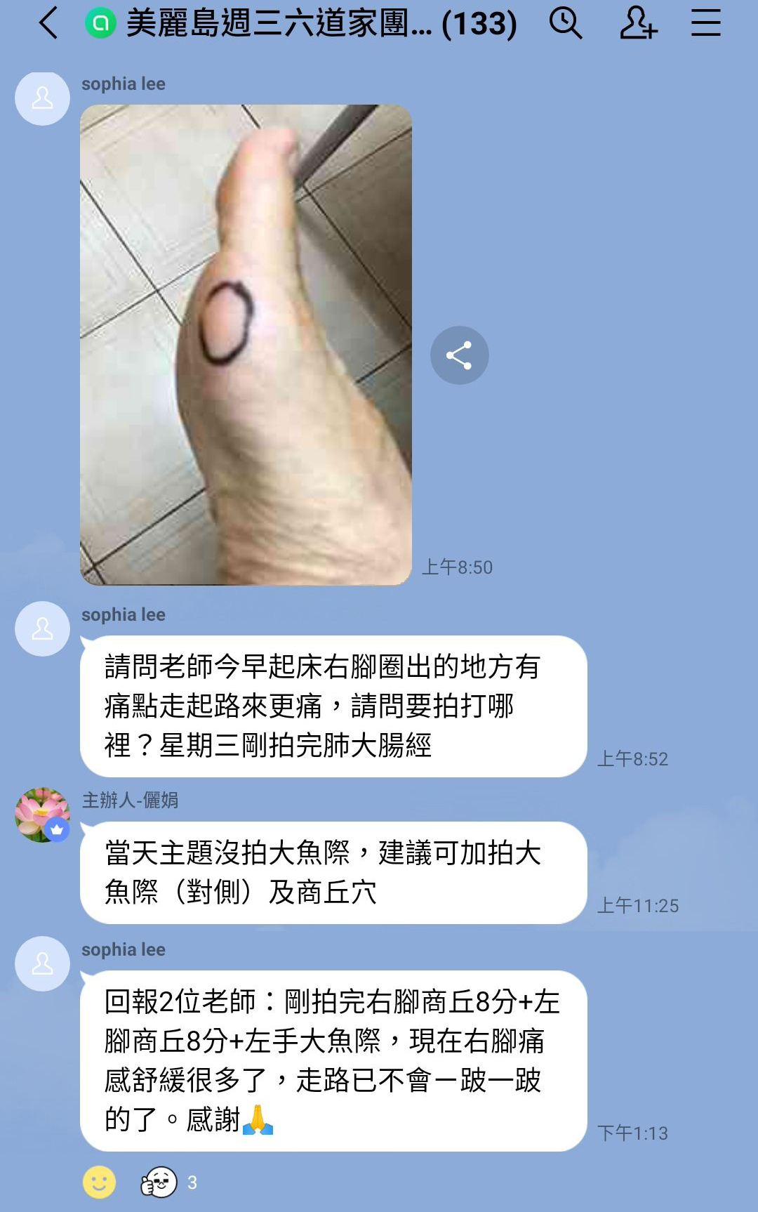 上週團拍時,她拍了脾胃經,所以今天拍了第二把斧頭的腰陽關和尾椎(氣血流注),拍完後,當場腳踝的不適就消失了。