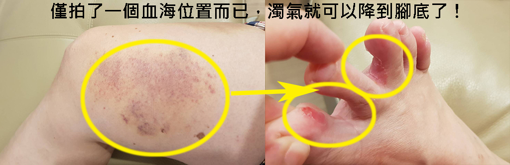另外,只有一隻腳有症狀時,屁股也有瘀堵,在屁股那裡要找痛點拍,拍到不痛的程度;