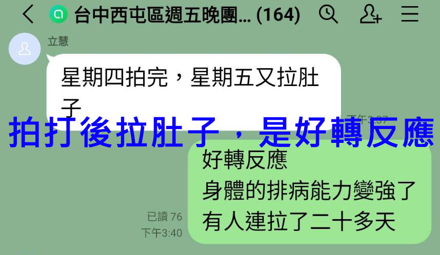 拍打後,手腳冷或皮膚病是由身體往四肢退,是症狀改善,反之則是症狀惡化。