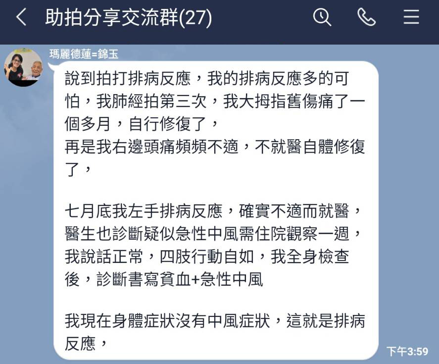 例如:拍打後,身體軀幹部份的皮膚病好了,剩下四肢而已,就是好事。