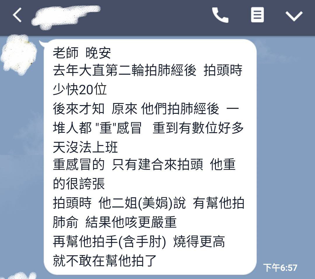 問:請教,昨天有請助拍老師拍打,拍打時很舒服,但回到家整個臉色翻白,冒冷汗,全身無力,家人看到很生氣,我不解的事,為什麼會氣沖有什麼方式可以改善,謝謝?