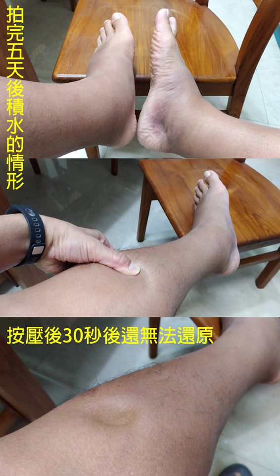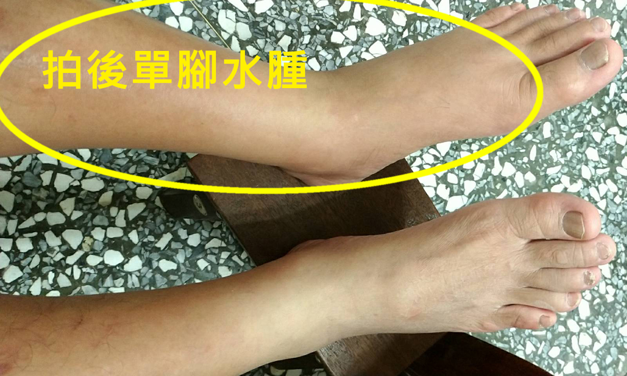 拍後有腳水腫的情形,是腎功能弱的人,很常見的一個排病反應!