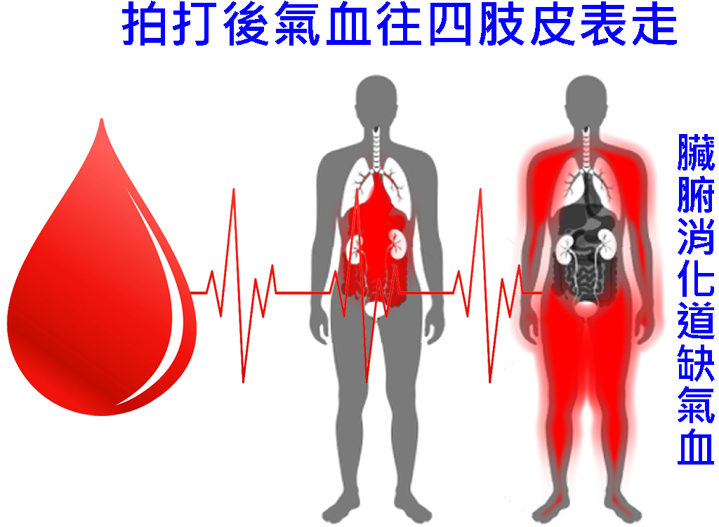 拍打後,原本臟腑居多的氣血,就會移往拍打點;