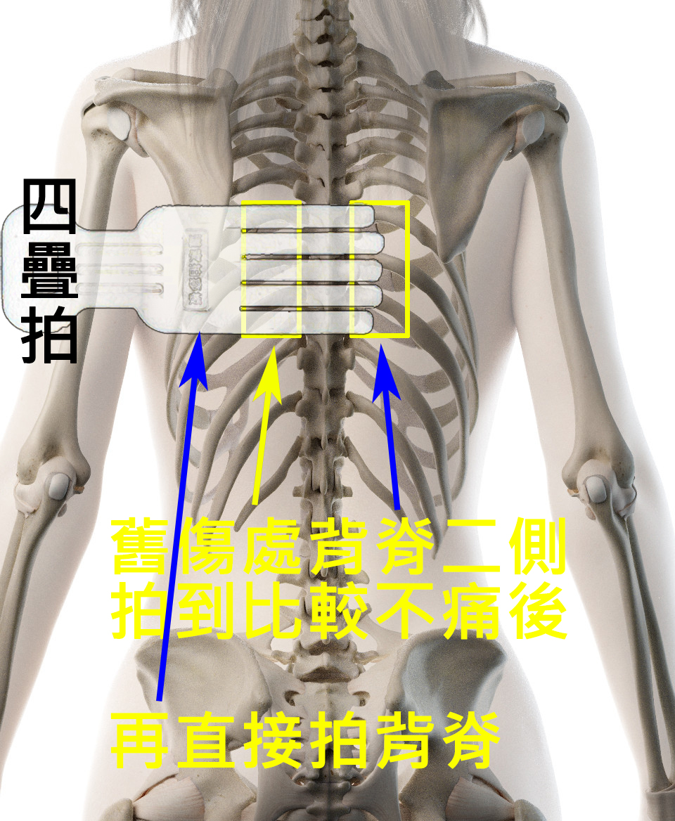 拍到背脊的傷處時,二側的位置,先拍個幾次,待拍到比較不痛時;