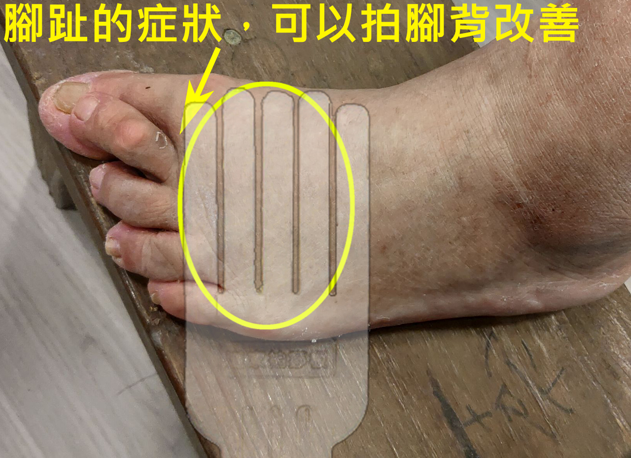 腳趾的症狀,諸如:受傷,各種指甲的症狀,癢,脫皮,皮膚病...皆可以優先拍腳背改善。