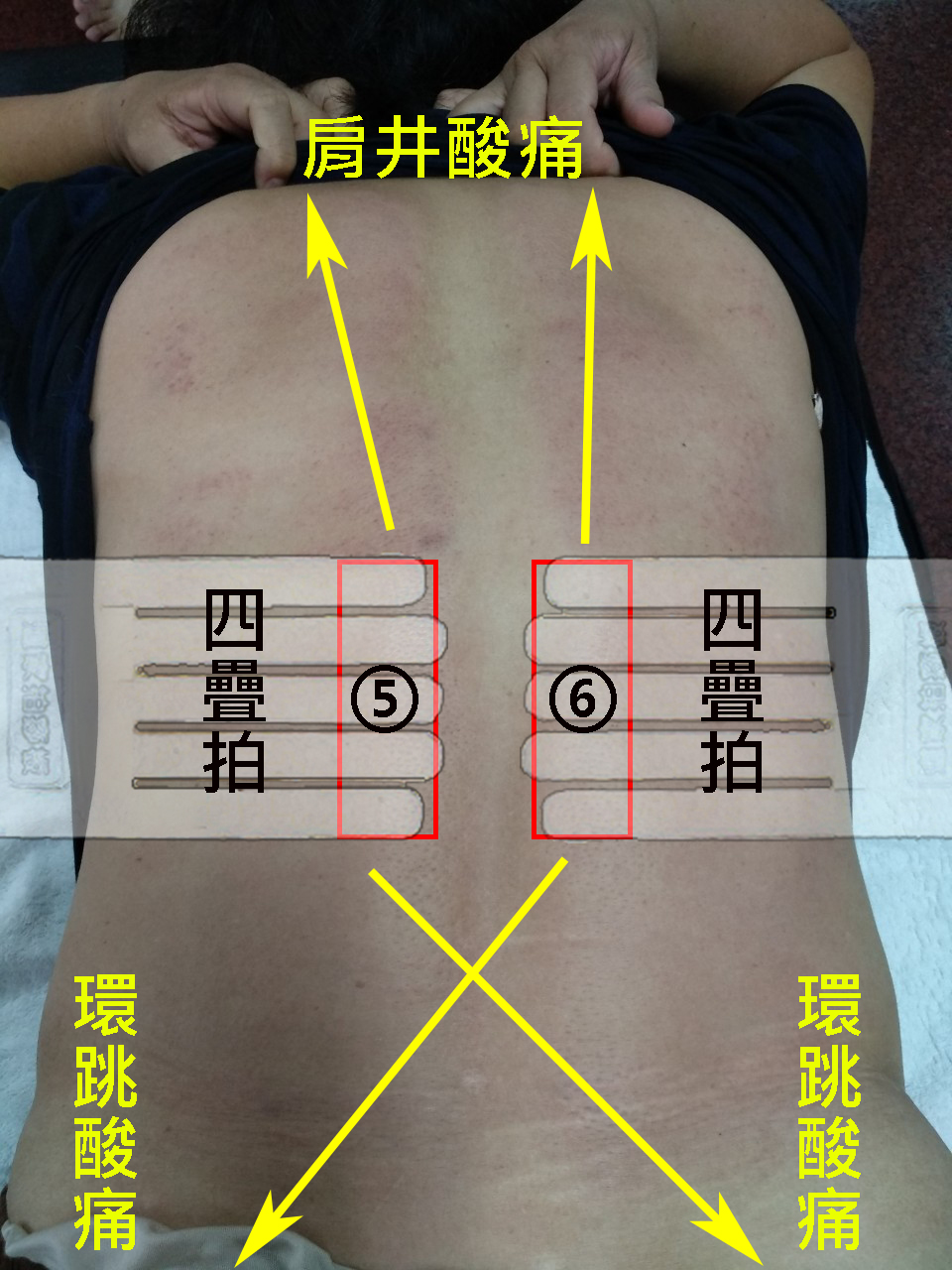 拍後背5,6的位置時,就有很多人會反應,同側的肩井或是對側的環跳會酸痛;