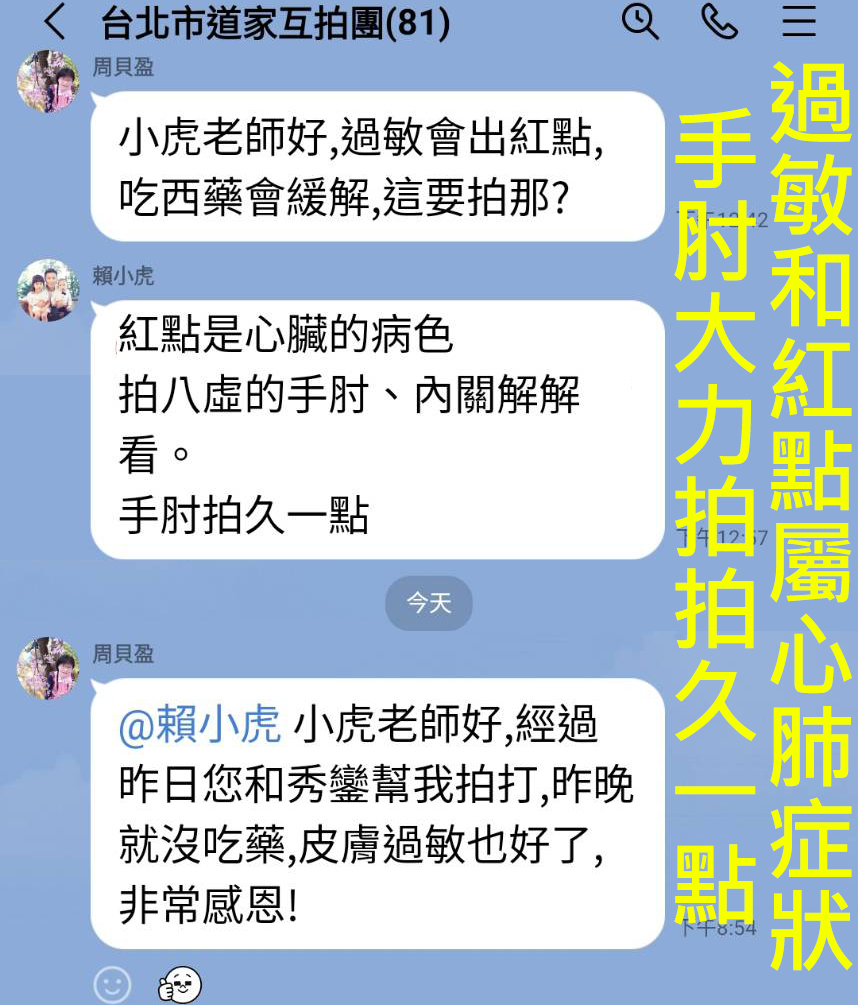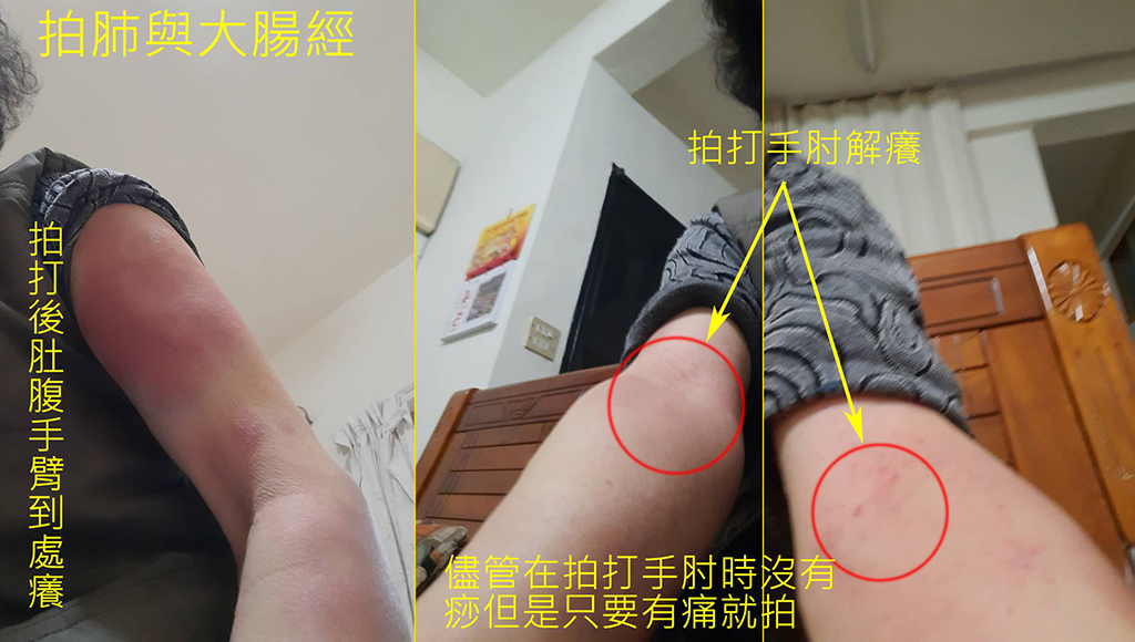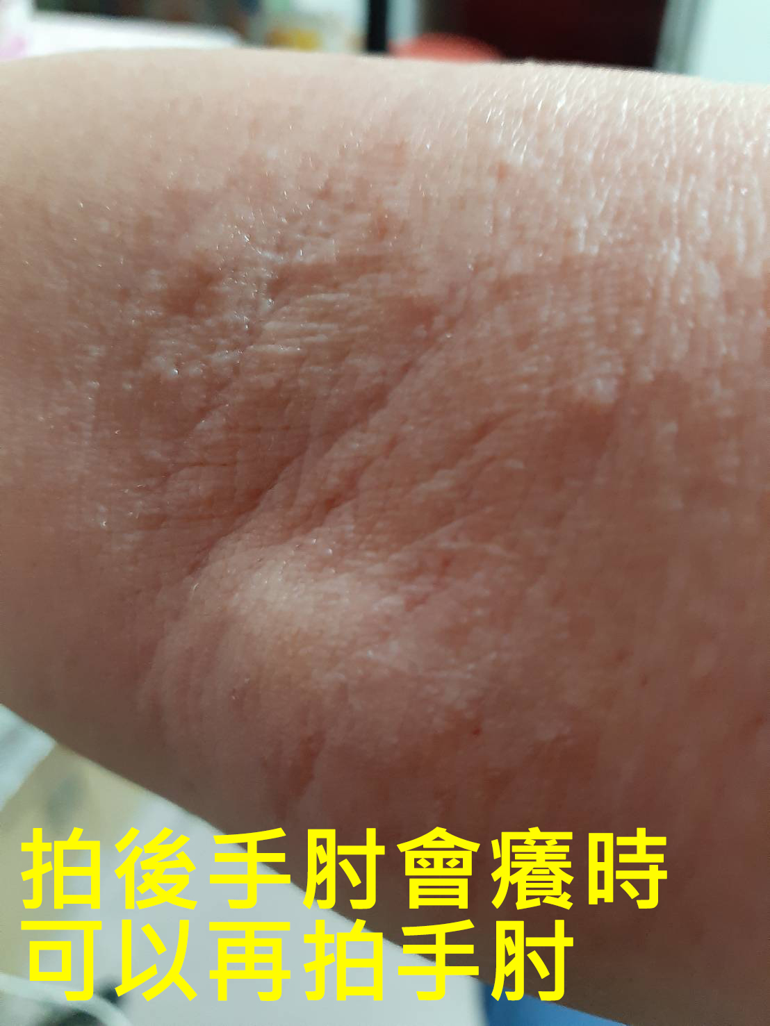 手肘是心肺的排毒位置,所以有疹子,就一直拍到毒排完為止;